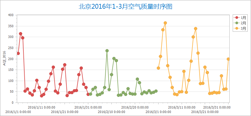 线形图表的特点是能够显示数据的变化趋势,反映事物的变化情况。例如:北京2014-2017年每月的空气质量折线图。如下图所示: