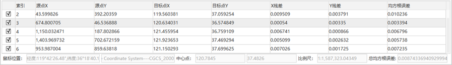 在配准精度的要求上,各个项目的要求是不同的。当某些控制点的均方根误差大于可接受的总均方根误差时,可以通过删除或重新编辑该控制点,减小总体均方根误差,提高配准精度的目的。