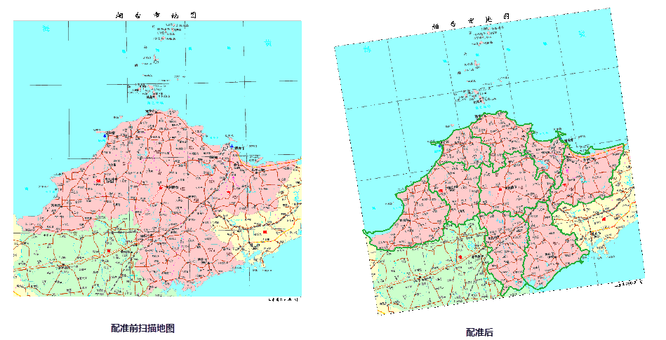 对扫描的烟台市地图进行配准,使其与烟台市的矢量面数据集(参考图层)坐标系一致,并且能够很好的与扫描图片相匹配,配准结果与参考数据集叠加显示的效果如下图所示,底图为配准后的扫描图片,绿色的线为参考数据集,使用的是 yantaiR 面数据集,对其进行透明化显示处理。