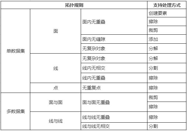 交互式拓扑处理对数据集和拓扑规则的支持情况如下表: