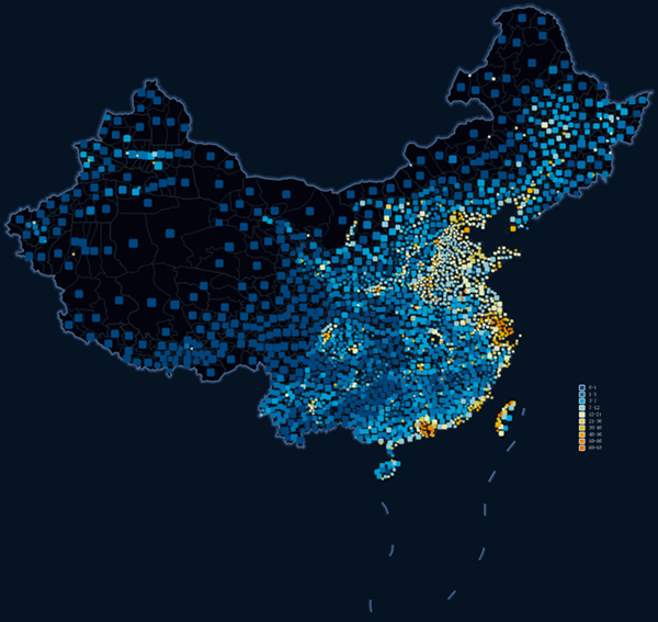自定义专题图适合用户想要表达内容比较丰富,属性分类结构较多的复杂情况。下图是城市夜间灯光亮度图,将县级行政区的夜间灯光平均亮度统计到县级行政点中,对县级行政点制作自定义专题图,符号大小表示行政区面积,颜色表示灯光亮度。