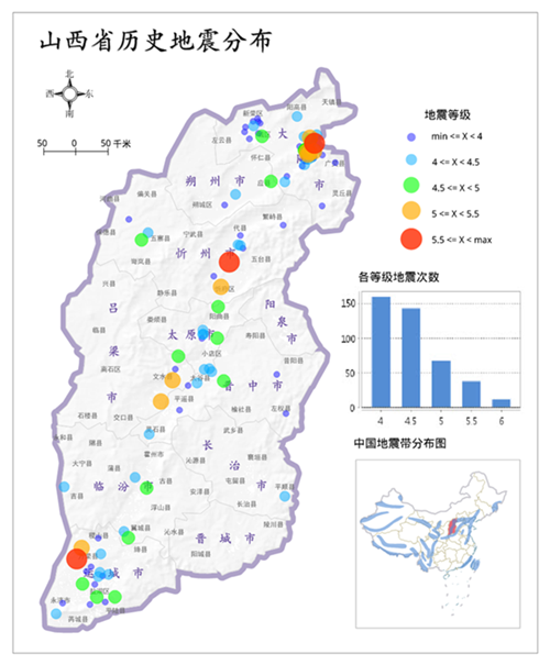 点击“专题图”选项卡中的“等级符号专题图”按钮,生成系统默认风格的等级符号专题图。用户可以通过等级符号专题图的窗口设置各个参数,自定义制作等级符号专题图。下图所示为等级符号专题图的示意图,是基于山西省历史地震等级建立的等级符号专题图,点符号越大表示该震级越高。