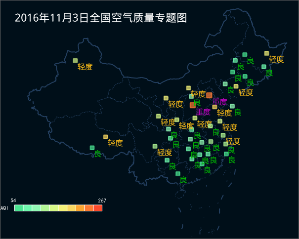 下图是以SampleData 示例数据中PM2.5.smwu 数据为例,以矢量点数据集PM25_20161103中的 Airlevel 作为单值字段值制作的单值标签专题图: