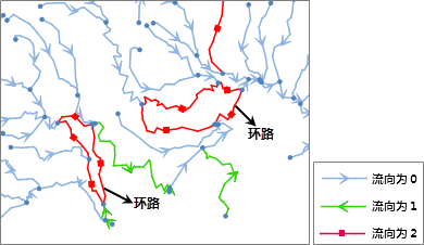 设施网络中,环路是指两条或两条以上流向值为 2(即不确定流向)的弧段构成的闭合路径。这意味着环路必须同时满足以下两个条件: