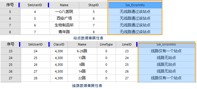 - 检查成功后,系统将自动在站点、线路数据集的属性表、站点与线路关系数据集和站点与出入口关系数据集的属性表中添加一个文本型字段,名称为“Sm_ErrorInfo”,写入对应的错误信息。各个数据集对应的错误信息内容及说明如下表所示。