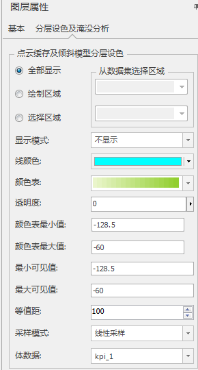 - 最小可见值:设置参与分层设色表达的模型高程/点云强度值的最小值,默认为模型高程/点云强度值的最小值。小于该值的模型将不显示分层设色。