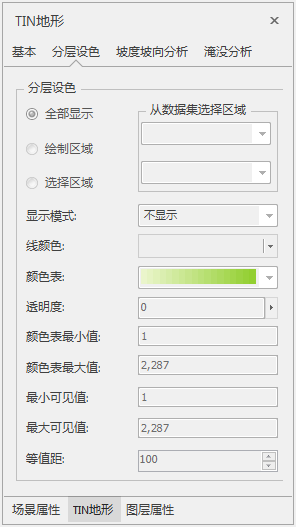 - 显示区域:点云缓存、倾斜摄影模型与TIN地形设置分层设色时,可自定义区域。