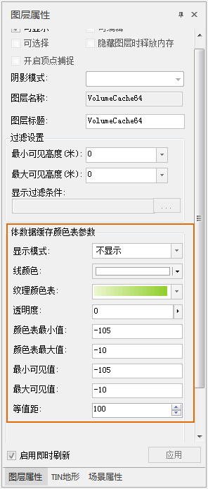 - 体数据:体数据参数是体元栅格叠加生成缓存的结果,可选择不同的体数据参数,表达不同的属性场。详情见体元栅格叠加模型瓦片。