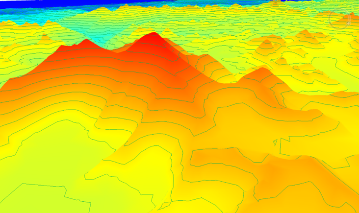分层设色是可视化表达的常用方式,它通过一定的颜色变化次序或色调深浅来表达和区别三维数据的不同属性。平台支持对模型数据集、倾斜摄影三维模型、点云三维瓦片数据、TIN地形设置颜色表、透明度、显示区域、最大/最小可见值等参数,实现模型的分层设色表达;另外支持三维栅格体数据设置颜色表。TIN地形分层设色效果图如下所示: