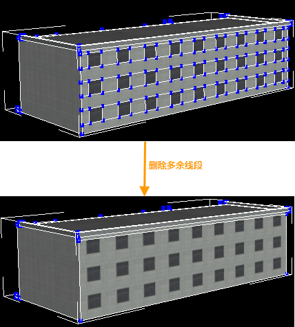 - 删除多余的线段、顶点和游离点,如下图所示,不要切出窗户上的线段,要用贴图表示:
