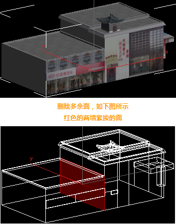 - 删除没必要的面,例如,楼房的底面或两墙挨着的面,如下图所示: