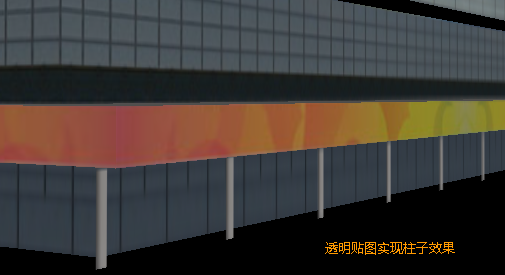 - 在某一排上柱子比较多的话应该采用透明贴图来实现柱子的效果,如下图所示: