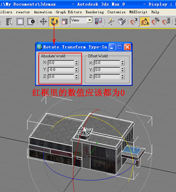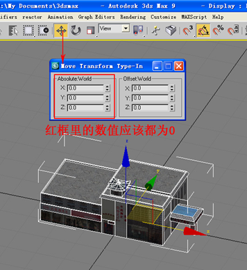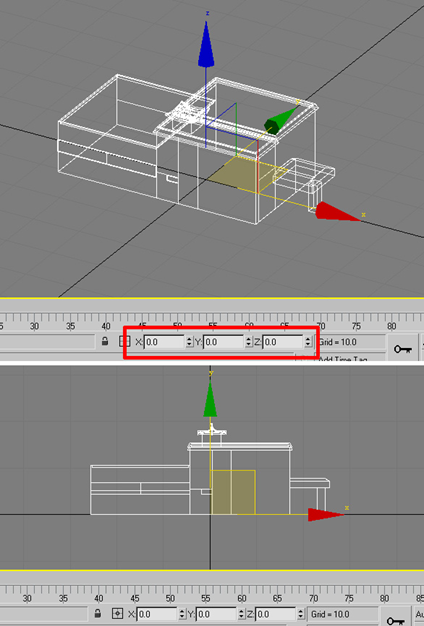 - 塌陷 Box,用 Box 去 Attach 模型物体,然后进入面子集或元素子集把 Box 删掉,这样模型物体的属性都和 Box 一致。最终建筑物的坐标轴还是应该在建筑物 X 轴、Y 轴的中心,Z 轴的最下面。不要使用坐标轴移动命令(AffectPivotOnly)来移动坐标轴。