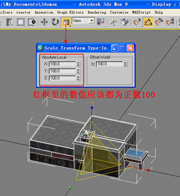 - 选中模型物体,选择缩放工具,在缩放工具上单击右键弹出数值框,此时数值框的数值都应该为正数100,如图所示: