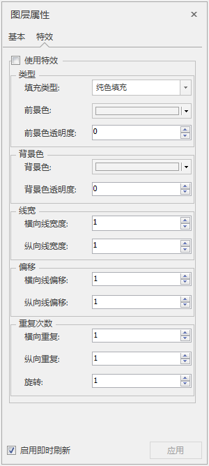 在图层管理器中选中三维面图层作为当前图层,“图层属性”界面中会出现特效的设置选项。首先需要勾选使用特效复选框,激活特效设置控件,包含三维线图层的类型、背景色、线框、偏移、重复次数等属性设置的功能控件。