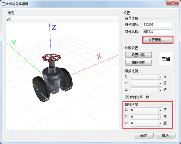 注意:制作阀门模型时,阀门底部管道应沿X轴方向,阀门开关则沿Z轴方向。若制作的模型符号方向与此设置不一致,需设置旋转角度,使其底部管道沿X轴,开关沿Z轴。