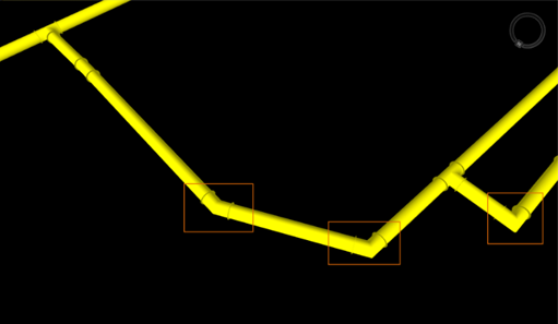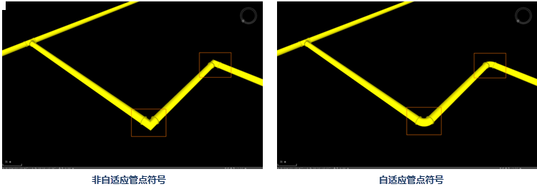 - 设置好三维管线的线型符号后,将显示默认自适应管点符号。默认的自适应管点符号颜色与管线颜色一致,带箍,箍长度为0.015米,弯头管点拐弯处为尖角,如下图。