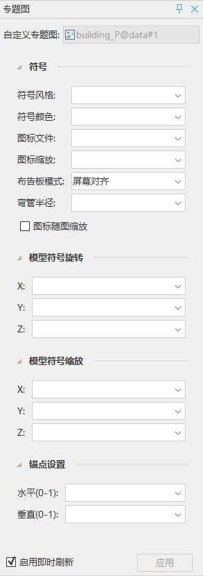 - 锚点设置:用于通过设置自定义专题图中图标对象的锚点与三维点的相对位置来确定图标对象的摆放位置。