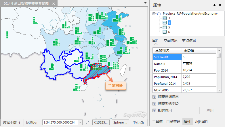 - 若选中多个对象,属性面板上方的树结点会显示当前地图窗口中的所有选中对象,可选中不同的对象的树节点,切换查看其属性信息。您可以在弹出的属性表窗口中,对多个对象的属性进行批量设置和修改。