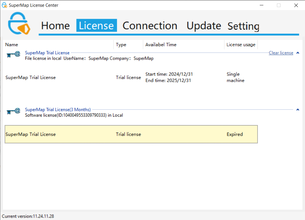 With SuperMap License Center, you can view license status, usage, and perform license management tasks such as updating licenses.