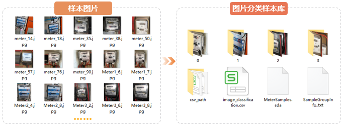 - Image Classification Sample Library: In the Image Classification Sample Library, according to the type of the sample image, the image is stored in the folder named by the category index, and the CSV, txt, SDA and other files of the Samples Category information are output. The following figure shows the sample library results of the ammeter image Samples Category.