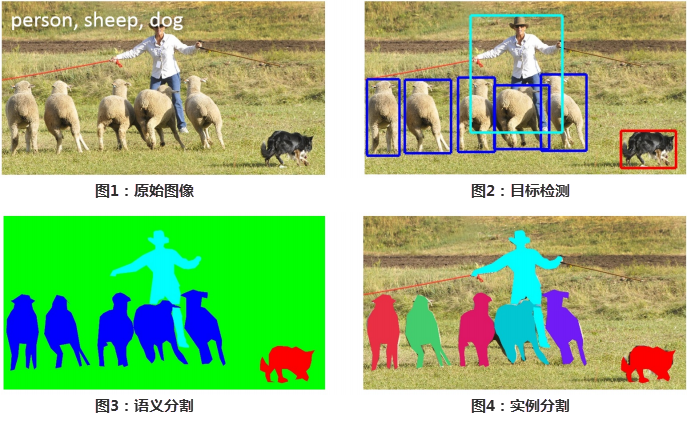 - Semantic Segmentation: The polygon is usually used to identify the edge of the sample. It is necessary to distinguish each pixel in the figure, as shown in Figure 3 below. It is enough to mark it as human, sheep, dog and grass.
