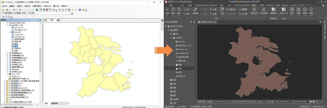 Support the migration of ArcGIS Personal GeoDatabase file (*.mdb) data to SuperMap Datasource. The data to be migrated can be selected during migration. When migrating to UDBXDatasource, the original grouping structure of the data in the MDB can be retained.