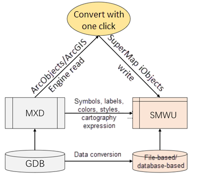 Map document migration includes two parts: one is data migration. For details, see Data Migration ; The other part is the migration of map documents, which mainly completes the creation, writing and setting of corresponding layers, features, labels, symbols and other information objects in MXD through the iObjects Java component interface provided by SuperMap. Thus completing the conversion from MXD of ArcGIS to SMWU of SuperMap.