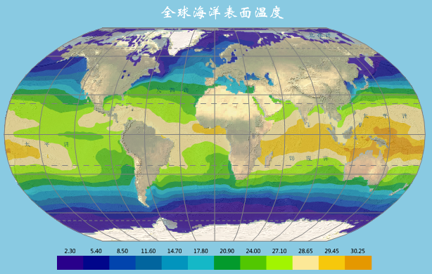 In SuperMap Sample Data SampleData-& > ThematicMap-& > Weather-& > For the global sea surface temperature thematic map of January 2008 in the Sea-Surface Temperature data, select the temperature thematic map layer to create a custom filling legend through the Custom Legend function, and the effect shown in the following figure is obtained.