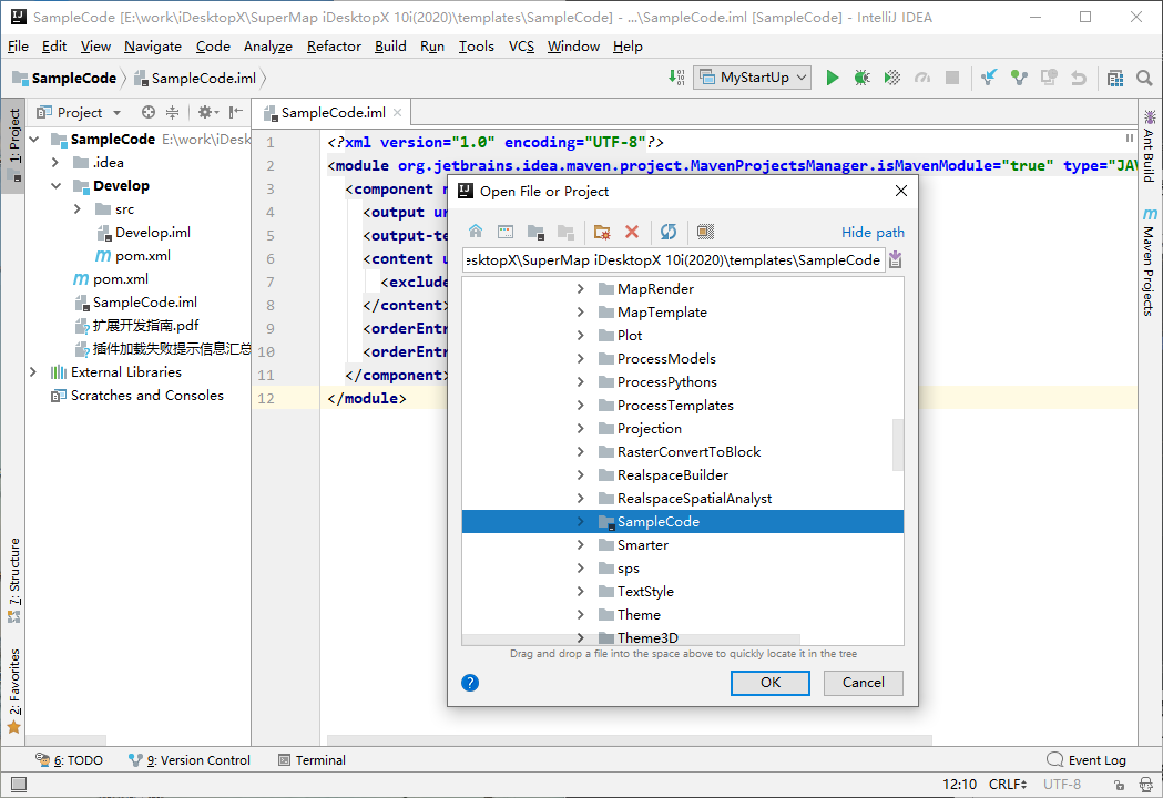 1. Open template project: IDEA-> File-> Open-> Select the directory SuperMap iDesktopX package \ templates \ SampleCode to open the Extension Development sample template project.