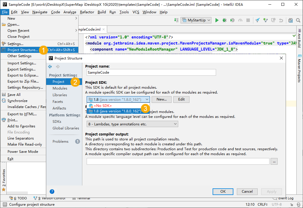 2. Set environment: Set the JDK environment of Project to 1.8. The setting method is: File-> Project Structure-> Project-> Project SDK-> Select 1.8 in the drop-down list.