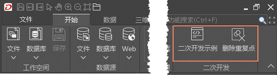 4. Compile: Click the Run or Debug button in the toolbar to automatically start SuperMap iDesktopX after compiling. After starting, the Secondary Development group will be added to the Start tab in the Ribbon. It contains two Function Buttons: Secondary Development Sample and Delete Duplicate Points. In this case, the environment is configured successfully, and the user can perform Extension Development based on SuperMap iDesktopX. Note: If SuperMap iDesktopX is not started automatically, it is recommended to update the IDEA version to 2020.2.2 or later.