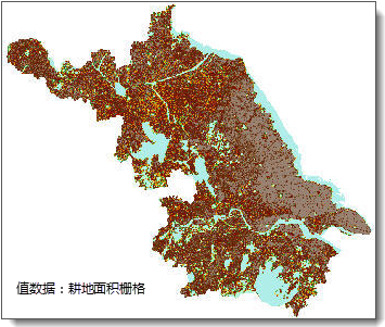As shown in the figure below, from left to right are the grid data of cultivated land area in a certain province, county-level administrative boundary data, and grid area statistical results. The statistical method used is summation to obtain the total cultivated land area within each county administrative region.