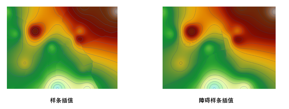 The figure below shows. The left figure shows the interpolation of the data set without obstacles and the right figure shows the interpolation of the data set with obstacles.