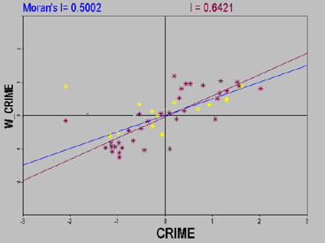 - In addition, potential spatial anomalies can be found by looking at the upper left and lower right quadrants of the Moran scatter plot. A circle with a radius of 2 is drawn with the center point of the quadrant of the scatter diagram as the center, and the observation points outside the circle can be considered as outliers. This is because, the Moran scatter plot is constructed with a standardized variable and its spatial lag, and a distance of 2 units on the plot means a deviation from the mean Two Standard Deviations, which can be regarded as an outlier.
