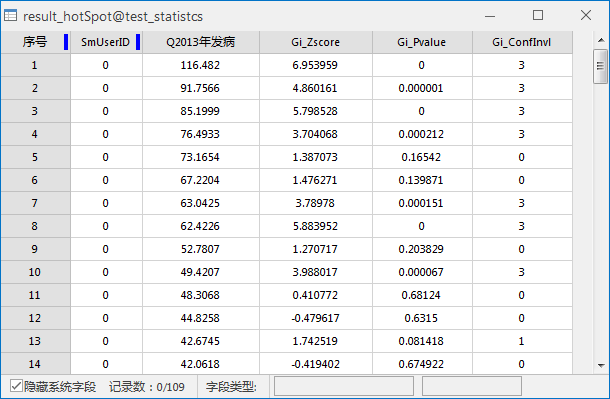 Carry out Hotspot Analysis on the incidence of viral hepatitis in a region in 2013, set the evaluation field as the number of cases in 2013, the conceptual model as Inverse Distance, and the Measure Distance method as Euclidean Distance. The spatial weight matrix is normalized, and others are defaulted. The Result Dataset property table is as follows: