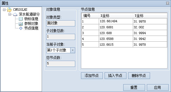 - Node Information: Nodes displays the Nodes of the current sub-object in the form of a table. Each record corresponds to a node of the sub-object. The information content is the coordinate information of the node. Unit is the degree. Node can be added, inserted or deleted, and Nodes can be exported as CSV File.