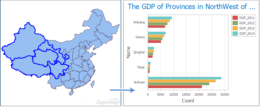 - For example, the GDP of the five provinces in Northwest China is counted separately in the National Area, that is, the graphic objects of the five provinces are selected in the Map, and the GDP comparison chart of Northwest China from 2012 to 2014 is made according to the above operation. The results are as follows: