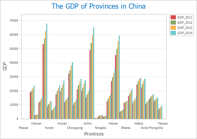 Bar chart features: can intuitively see the size of each data, easy to Compare the difference between Data. For example, the GDP of different provinces in China is counted as shown in the figure below.