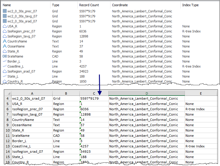 - Export Content to Table: Click the Export Content to Table button in the toolbar to export the display information in Current Windows as a *.xlsx, *.csv, or *.xls file. As shown in the figure below, export the Dataset Information of a Datasource in Workspace View as a table file.