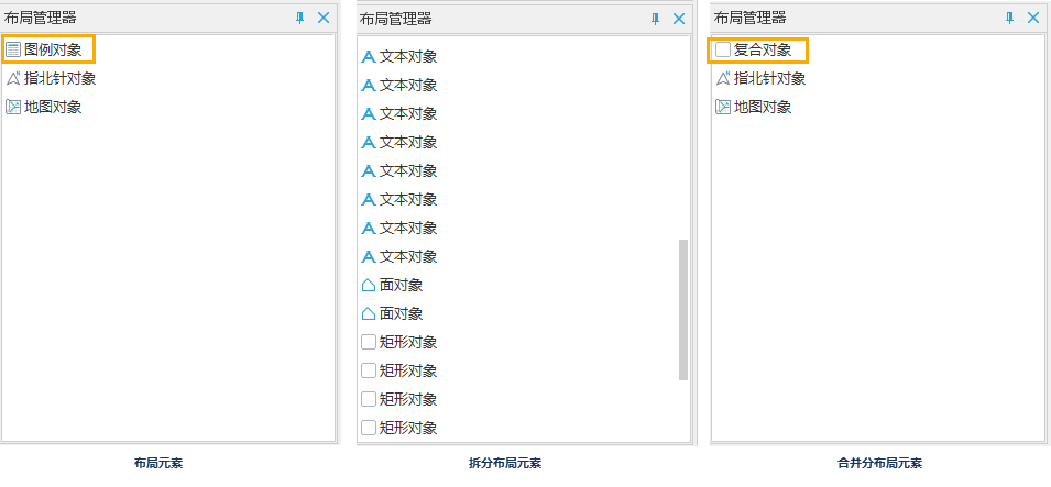 Layout Manager manages All Objects in a layout, including vector objects, picture objects, Tabel objects, Diagram objects, Maps, scale bar objects, and North Arrow. In Layout Manager, you can manage layout objects through Context Menu, such as split or Combine Layout Elements, top and bottom, etc., as follows: