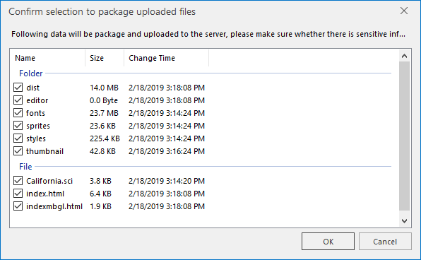 - Click the Publish button to pop up the Confirm Selection dialog box. You need to check the Data Information to be uploaded to the server in the list to avoid publishing sensitive information by mistake.