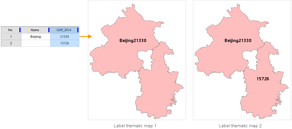 - If the field expression is displayed by connecting multiple fields through SQL Expression, and the expression field participating in the connection has a text type field, when the text type field value is null, the set thematic map label will be regarded as an invalid label and cannot be displayed normally. Because SQL Expression does not support null operations. As shown in the following figure, the two connected fields are Name (text field) and GDP _ 2000. Because the Name field value of object 2 is null, the label of the object is not displayed normally, as shown in Figure 1.