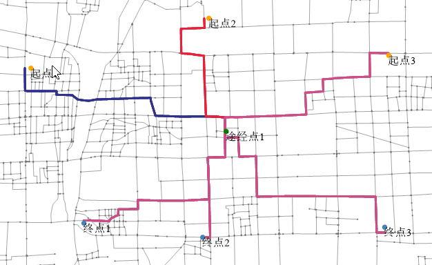 Multi-The point Optimal Path AnalysisAnalyst Result is as follows: each starting point corresponds to a color, and the overlapping part displays the color of the last Analyst Result.