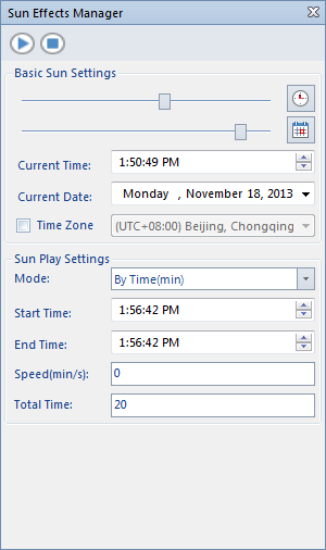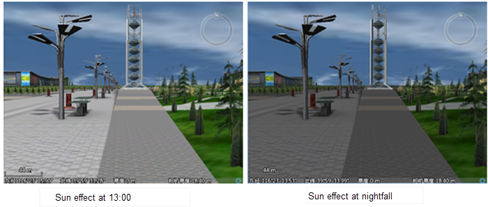 - Click the " Track" button in the " Browse" group, and the slider for sun effect management will pop up in the scene. You can set the Display Method of Sun-illumination and modify the movement track of sunlight on the ground. Note that only when the sun effect is enabled, that is, the "Visible" button is activated, can parameters of the "3D Sun Effect Management" interface be set.