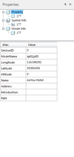 Select the Model Dataest object in the scene, right-click, and select the Properties command in the pop-up Context Menu to pop up the Properties panel. The detailed Attributes of the selected Model Object are displayed in the Attributes panel, including the Object Properties ", Spatial Info", and Model Info "of the Model Object. Click the corresponding tab to view the Model Object information of different categories.