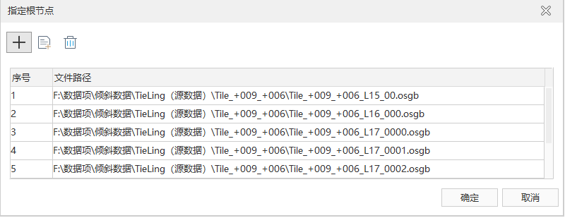 • Specify Root Node: Support setting of Specify Root Node. Click the "Specify Root Node" button to pop up the "Specify Root Node" dialog box as shown below. The root node file can be deleted and added through the toolbar tool. Among them, Add oblique photo graphic files according to conditions can Batch add all root node files that meet custom conditions (File Name represented by wildcard) in the specified folder to the File List.