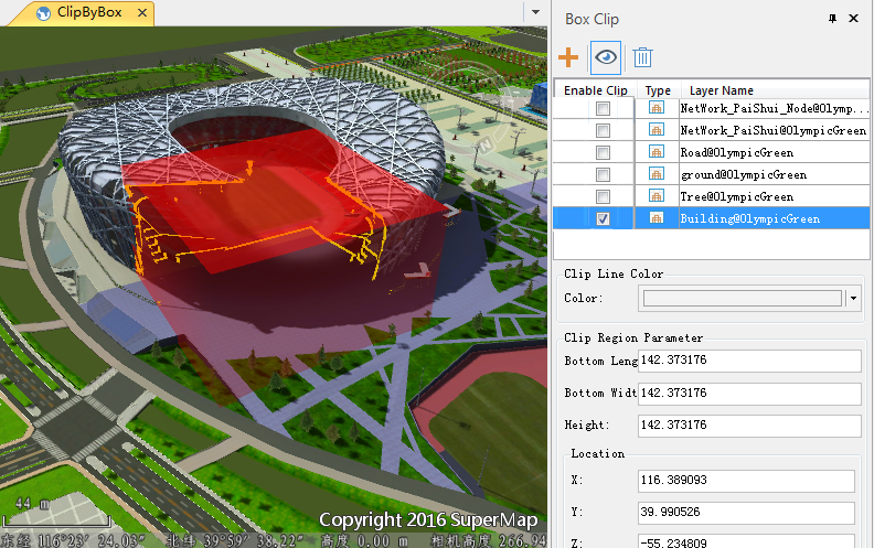 button in the toolbar to draw a quadrilateral area in the scene, and the system will automatically generate a Box based on this area. The size of the generated Box can be adjusted by inputting the values of length, width, height and Z-axis Rotation angle, and its Position Info can be adjusted by inputting the values of X, Y and Z. Make changes at the Clip Region Settings "parameter and the Location parameter. As shown in the following figure.