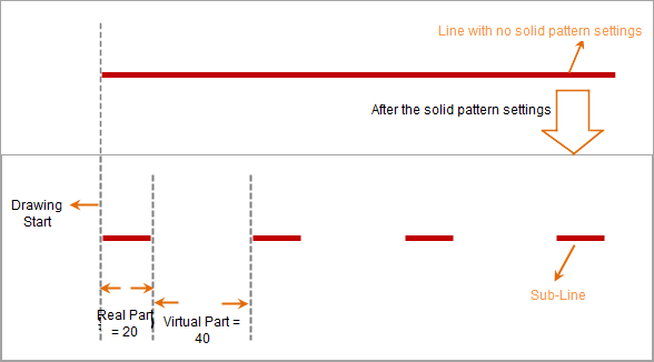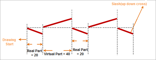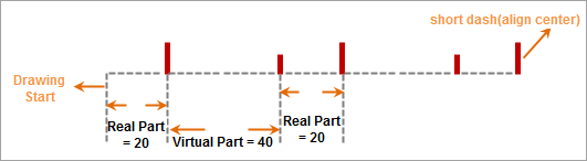 The Virtual-real Mode of the subline is used to determine which distance to draw and which distance not to draw on a subline, so as to make a subline similar to the dash type, as shown in the following (left figure), the dash type subline (system linetype). The setting of Virtual-Real Mode is as shown in the drawing. The blue color block represents the distance of the real part, and the distance value is shown by the number on the color block; the gray color block represents the distance of the imaginary part, and the distance value is shown by the number on the color block.