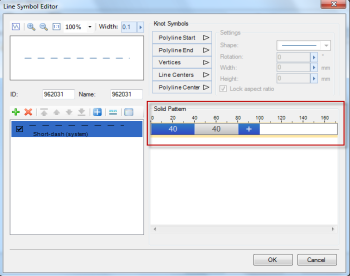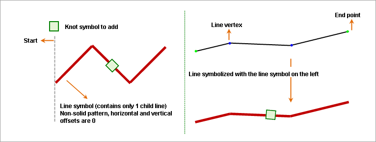 Subline Middle Point Add End Symbol. The effect is significant when symbolizing a line object. If Middle Point Add End Symbol is set for a subline in a linetype symbol, when symbolizing a line object with that linetype symbol, The specified End Symbol is added to all nodes of the line object except the two end points of the line object. As shown in the following figure, the Middle PointEnd Symbol is added in the setting sub-line, and the effect set can be previewed in the Linear Symbol Editor only when the "Polyline" preview is used. Sublines symbolize a polyline object as shown in the following figure.